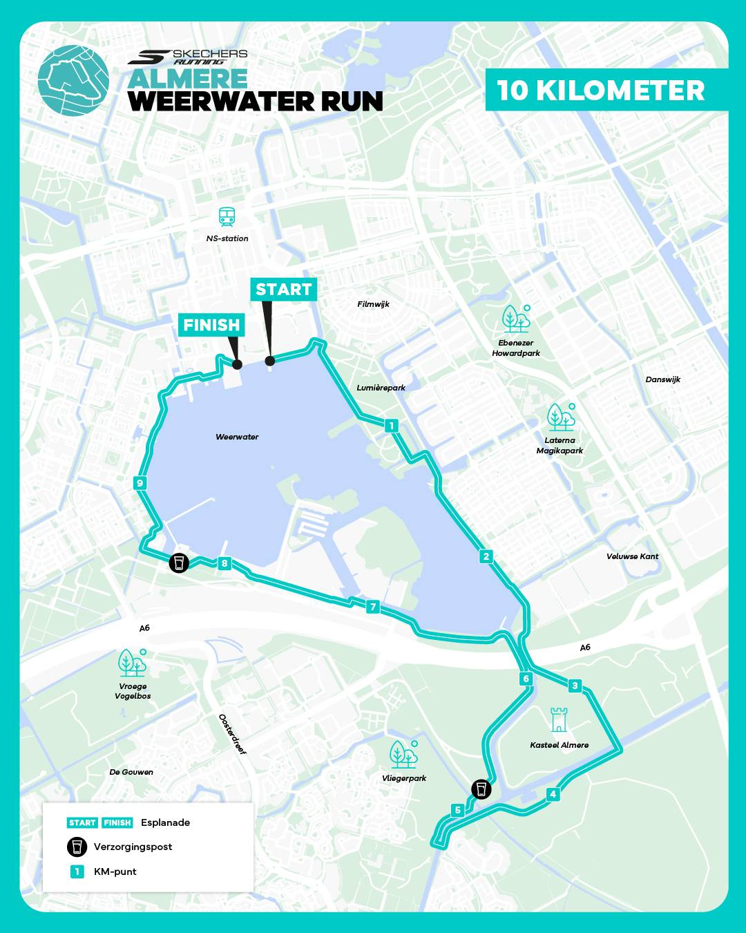 De 10 KM neemt je mee door de mooie natuur van Almere en omgeving. Deze uitdagende route gaat o.a. langs het Weerwater en Kasteel Almere. Ervaar het mooiste van Almere op deze unieke 10 KM route!