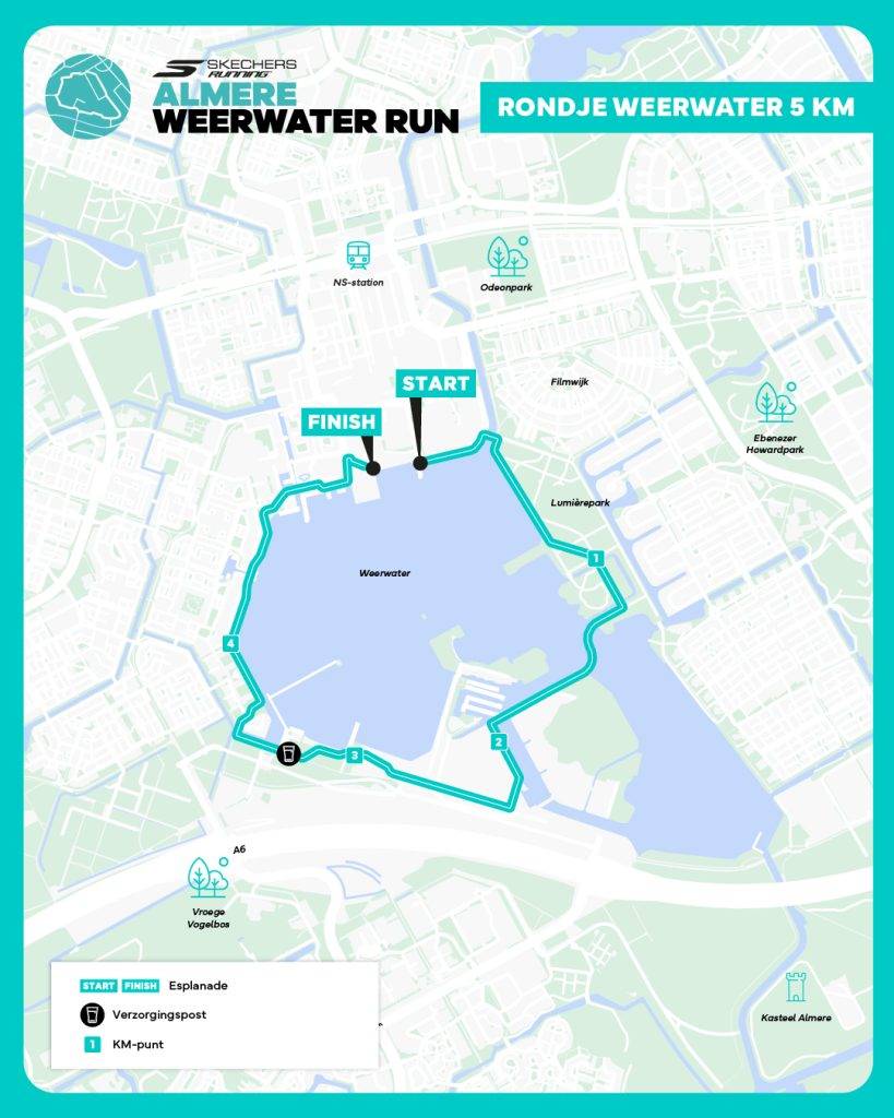 De Skechers Almere Weerwater Run brengt mensen in beweging! Het Rondje Weerwater van 5 KM is een laagdrempelige afstand, waarbij je als deelnemer wel geniet van een volwaardig parcours. Het Rondje Weerwater start op de Esplanade, loopt rond het Weerwater en finisht op de sfeervolle Esplanade. Als deelnemer ontvang je een startnummer met geïntegreerde chip, zodat je looptijd precies wordt gemeten. Natuurlijk ontvang je bij de finish je welverdiende medaille!